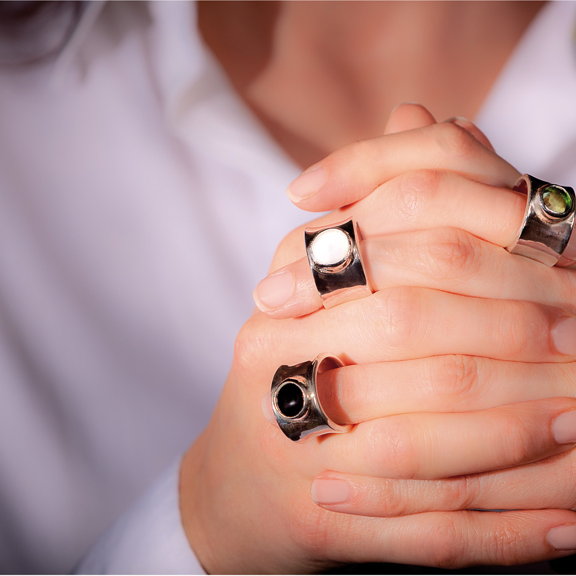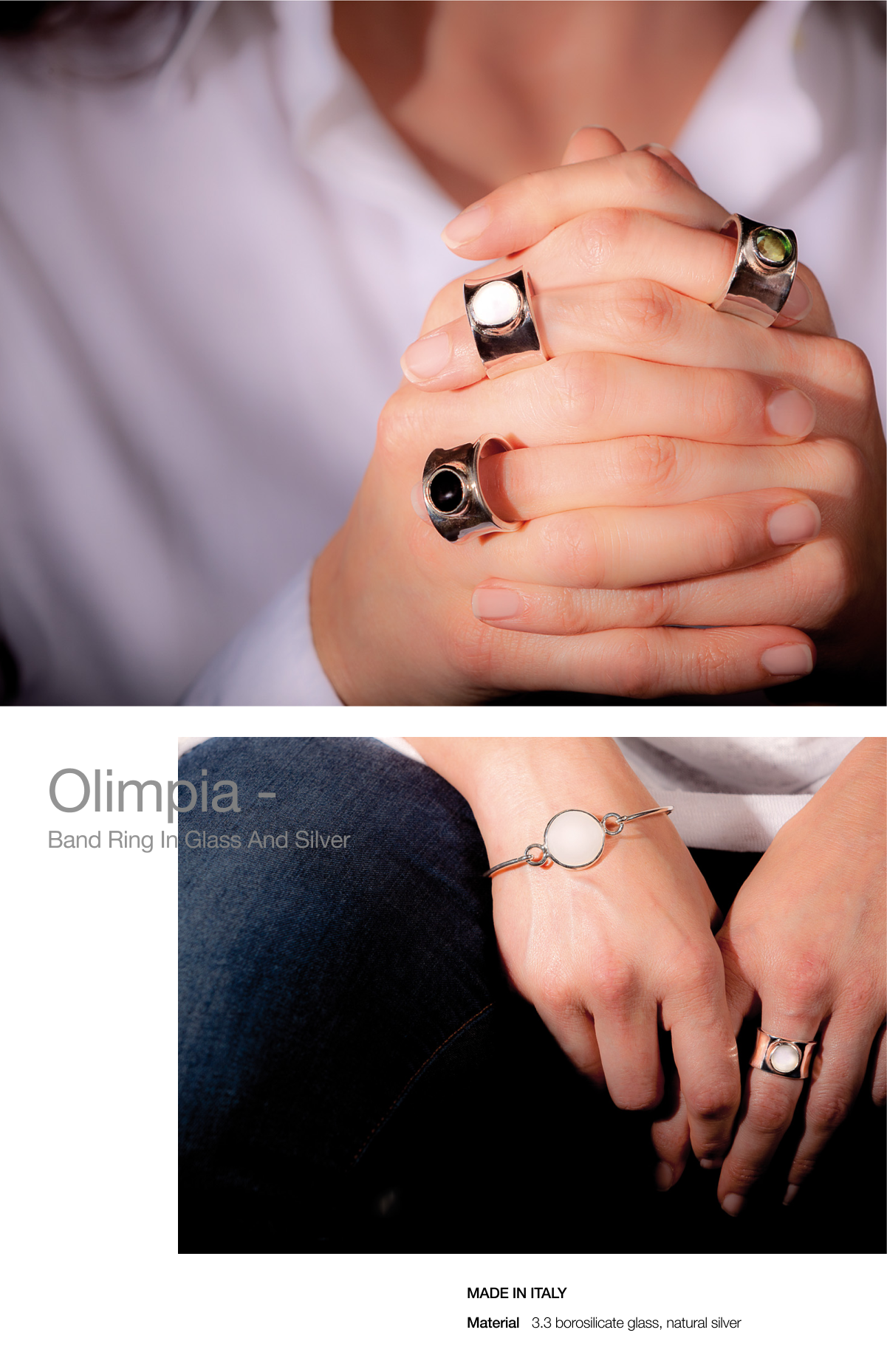 위대한 미인, 올림피아 손으로 가장자리를 다듬고 끌로 깎아 만든 천연 은으로 만든 귀중한 밴드 링 컬렉션입니다. 컬러 유리 카보숑이 매력을 더욱 돋보이게 합니다. 선탠 위에 여름에 여성을위한 놀라운. 화이트, 블랙, 그린, 다크 블루의 4가지 색상으로 제공되는 유리 카보숑